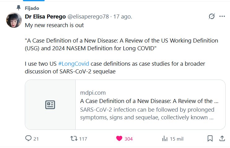 Dra. Elisa Perego @elisaperego78 . Mi nueva investigación ya está disponible: «Definición de caso de una nueva enfermedad: Revisión de la definición de trabajo estadounidense (USG) y la definición de la NASEM de 2024 para COVID persistente». Utilizo dos definiciones de caso estadounidenses de #CovidPersistente como casos de estudio para un debate más amplio sobre las secuelas del SARS-CoV-2