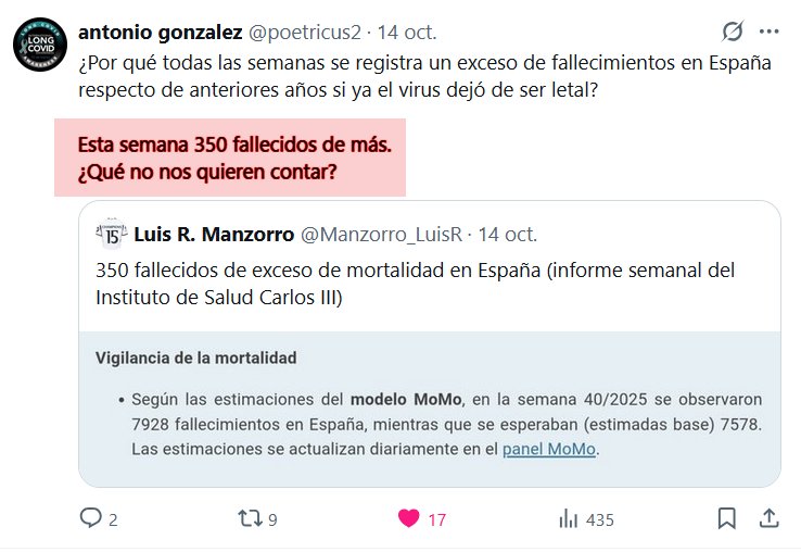 ESCUCHO VOCES (QUE SON GRITOS A LOS SORDOS) antonio gonzalez @poetricus2 · 14 oct. ¿Por qué todas las semanas se registra un exceso de fallecimientos en España respecto de anteriores años si ya el virus dejó de ser letal? Esta semana 350 fallecidos de más. ¿Qué no nos quieren contar?