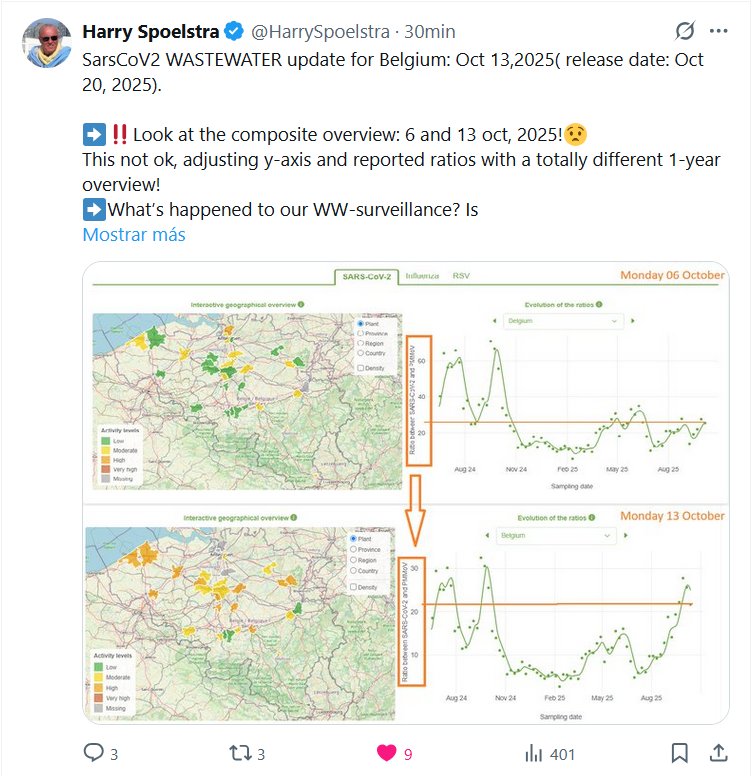 OTRO AÑO OCULTANDO ESTADÍSTICAS COVID Dr. Harry Spoelstra @HarrySpoelstra · Actualización de aguas residuales de SARS-CoV-2 para Bélgica: 13 de octubre de 2025 (fecha de publicación: 20 de octubre de 2025). ➡️‼️¡Miren el resumen compuesto: 6 y 13 de octubre de 2025! 😧 Esto no está bien. ¡Se están ajustando el eje Y y los ratios informados con un resumen de un año totalmente diferente!