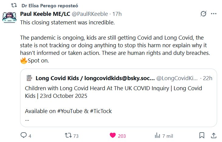 La Dra. Elisa Perego reposteó a Paul Keeble ME/LC @PaulRKeeble Esta declaración final fue increíble. La pandemia continúa, los niños siguen contagiándose de COVID y COVID prolongado, el Estado no está haciendo un seguimiento ni tomando medidas para detener este daño, ni explicando por qué no ha informado ni ha tomado medidas. Se trata de violaciones de los derechos humanos y del deber. 🔥Muy acertado.