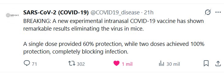 SARS-CoV-2 (COVID-19) @COVID19_disease · ÚLTIMA HORA: Una nueva vacuna experimental intranasal contra la COVID-19 ha mostrado resultados notables eliminando el virus en ratones. Una sola dosis proporcionó una protección del 60 %, mientras que dos dosis lograron una protección del 100 %, bloqueando por completo la infección.