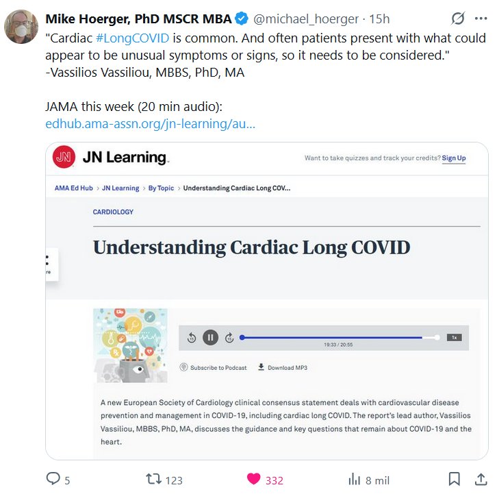 EN INGLÉS Mike Hoerger, PhD, MSCR, MBA @michael_hoerger · «La COVID-19 prolongada cardíaca es común. Y a menudo, los pacientes presentan síntomas o signos que podrían parecer inusuales, por lo que es importante tenerlo en cuenta.» -Vassilios Vassiliou, MBBS, PhD, MA