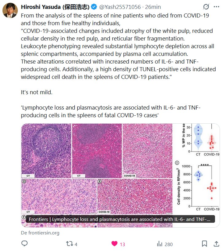 «No es leve» Hiroshi Yasuda (保田浩志) @Yash25571056 · «Del análisis de los bazos de nueve pacientes fallecidos por COVID-19 y de cinco individuos sanos, «Los cambios asociados a la COVID-19 incluyeron atrofia de la pulpa blanca, reducción de la densidad celular en la pulpa roja y fragmentación de las fibras reticulares.»