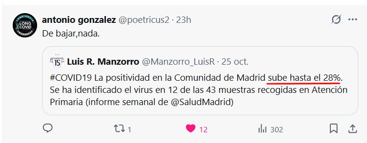 27 DE OCTUBRE DE 2025, LLEGANDO A 2026: SEGUIMOS CON EL «FIN DE PANDEMIA» Prof. Antonio González @poetricus2 · De bajar,nada. Cita Luis R. Manzorro @Manzorro_LuisR · 25 oct. #COVID19 La positividad en la Comunidad de Madrid sube hasta el 28%. Se ha identificado el virus en 12 de las 43 muestras recogidas en Atención Primaria (informe semanal de @SaludMadrid)