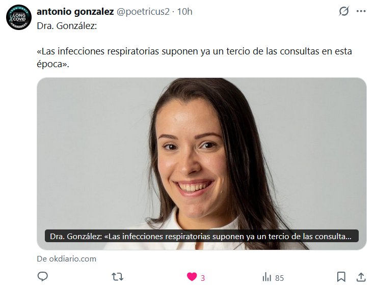 «Incluso el todavía circulante SARS-CoV-2″ Médico de Atención Primaria Dra. González: «Las infecciones respiratorias suponen ya un tercio de las consultas en esta época» Posted on octubre 27, 2025 por coronado https://okdiario.com/salud/dra-gonzalez-infecciones-respiratorias-suponen-ya-tercio-consultas-esta-epoca-15518583