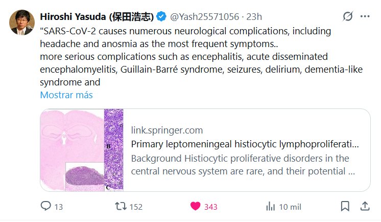 Hiroshi Yasuda (保田浩志) @Yash25571056 · «El SARS-CoV-2 causa numerosas complicaciones neurológicas, incluyendo cefalea y anosmia como los síntomas más frecuentes. Se pueden observar complicaciones más graves como encefalitis, encefalomielitis diseminada aguda, síndrome de Guillain-Barré, convulsiones, delirio, síndrome similar a la demencia y trastornos psiquiátricos, lo que sugiere capacidad de neuroinvasión.