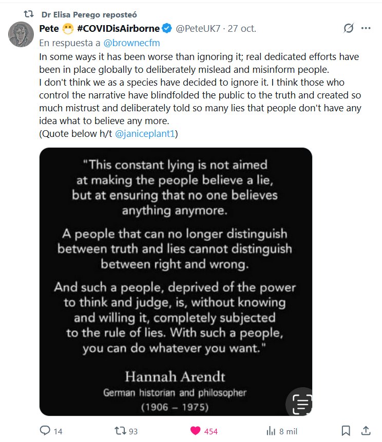 ESCUCHO VOCES La Dra. Elisa Perego reposteó Pete 😷 #COVIDisAirborne @PeteUK7 «En cierto modo, ha sido peor que ignorarlo; se han llevado a cabo esfuerzos globales realmente deliberados para engañar y desinformar a la gente. No creo que como especie hayamos decidido ignorarlo. Creo que quienes controlan el discurso han cegado al público ante la verdad, han creado tanta desconfianza y han dicho tantas mentiras deliberadamente que la gente ya no sabe qué creer.»