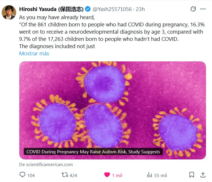 Los diagnósticos incluyeron no solo autismo, sino también trastornos del habla y del lenguaje, trastornos de la función motora y otras afecciones. La infección por COVID-19 durante el embarazo se asoció con un aumento de casi el 30 % en la probabilidad de padecer estas afecciones. Dado que el SARS-CoV-2 rara vez atraviesa la placenta, los científicos plantean la hipótesis de que no es el virus en sí el que aumenta el riesgo. Más bien, sospechan que la activación del sistema inmunitario en la persona embarazada podría ser la responsable. Tengan cuidado, señoras. «La COVID-19 durante el embarazo podría aumentar el riesgo de autismo, según sugiere un estudio».