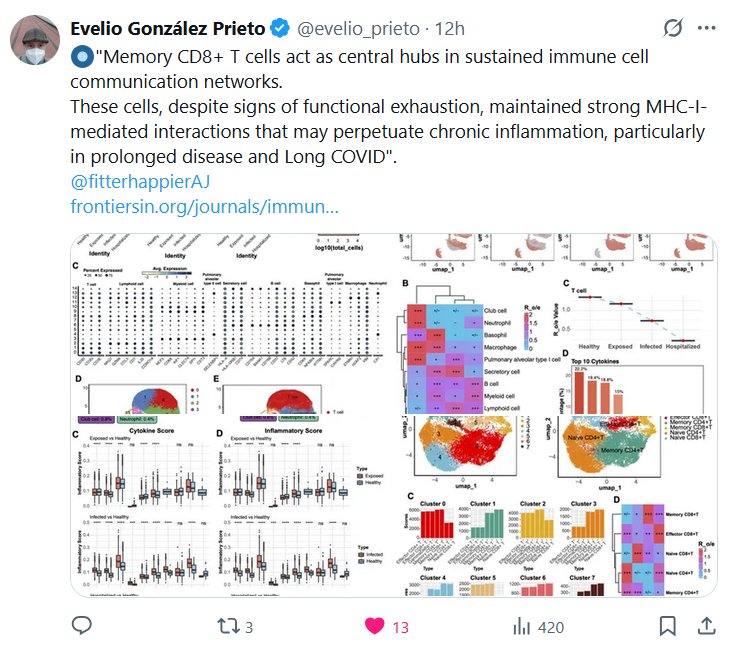 DR. Evelio González Prieto @evelio_prieto · 🔘»Las células T CD8+ de memoria actúan como centros neurálgicos en las redes de comunicación celular inmunitaria sostenida. Estas células, a pesar de presentar signos de agotamiento funcional, mantienen fuertes interacciones mediadas por MHC-I que pueden perpetuar la inflamación crónica, especialmente en enfermedades prolongadas y en el COVID persistente».