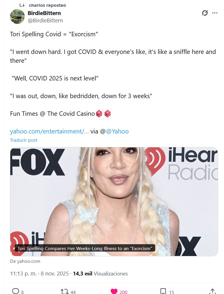 Charlos reposteó BirdieBittern @BirdieBittern · 8 nov. Tori Spelling Covid = «Exorcismo» «Me puse muy mal. Me contagié de COVID y todos decían que era solo un resfriado de vez en cuando.» «Bueno, el COVID de 2025 es otro nivel.» «Estuve postrada en cama durante 3 semanas.» Momentos divertidos en el Casino Covid 🎲🎲