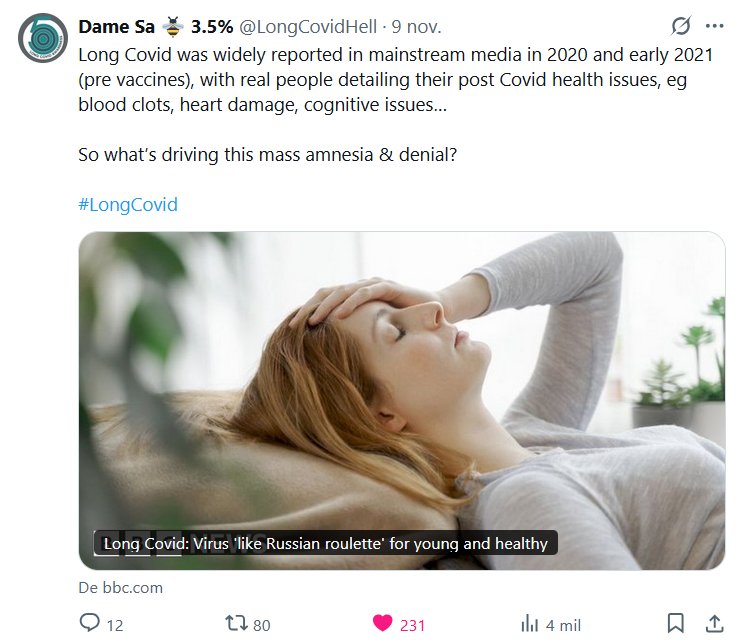 Dame Sa 🐝 3.5% @LongCovidHell · El Covid persistente tuvo gran repercusión en los principales medios de comunicación en 2020 y principios de 2021 (antes de las vacunas), con testimonios reales de personas que detallaban sus problemas de salud posteriores a la COVID-19, como coágulos sanguíneos, daños cardíacos y problemas cognitivos… ¿Qué está provocando esta amnesia colectiva y esta negación? #LongCovid BBC: Covid persistente: El virus es «como una ruleta rusa» para jóvenes y sanos