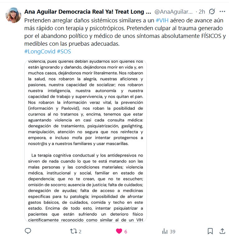 Ana Aguilar Democracia Real Ya! Treat Long Covid! @AnaAguilarPAC · Pretenden arreglar daños sistémicos similares a un #VIH aéreo de avance aún más rápido con terapia y psicotrópicos. Pretenden culpar al trauma generado por el abandono político y médico de unos síntomas absolutamente FÍSICOS y medibles con las pruebas adecuadas. #LongCovid #SOS