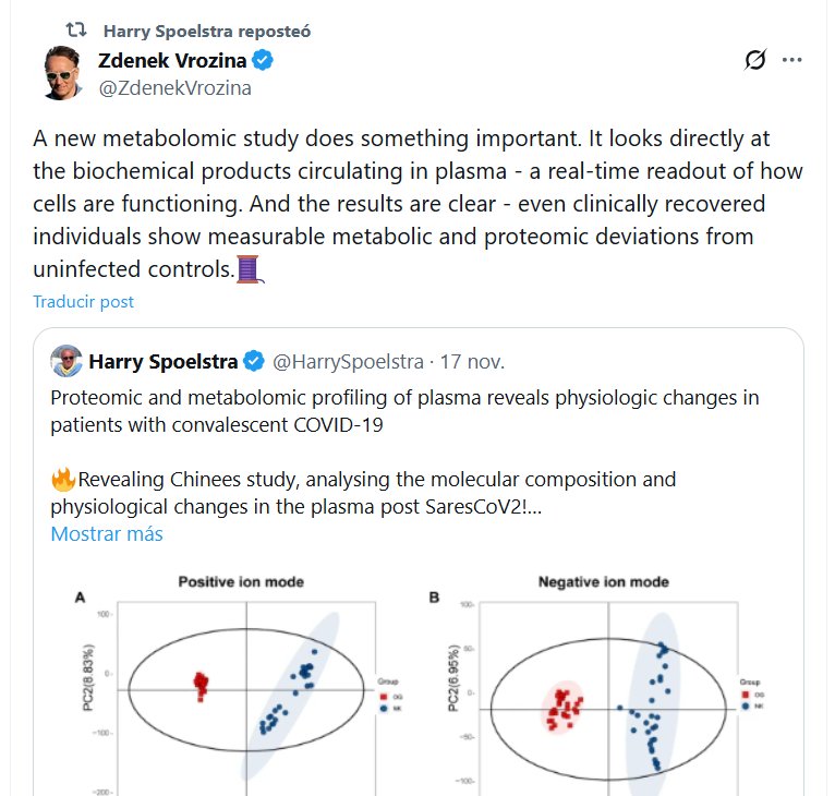 Dr. Harry Spoelstra reposteó Zdenek Vrozina @ZdenekVrozina A new metabolomic study does something important. It looks directly at the biochemical products circulating in plasma – a real-time readout of how cells are functioning. And the results are clear – even clinically recovered individuals show measurable metabolic and proteomic deviations from uninfected controls.🧵
