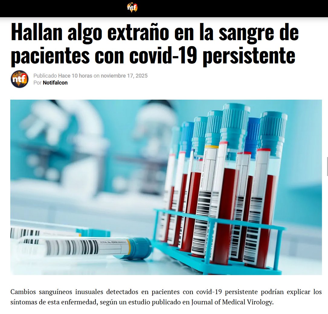 Hallan algo extraño en la sangre de pacientes con covid-19 persistente Posted on noviembre 18, 2025 por coronado https://notifalcon.com/2025/11/hallan-algo-extrano-en-la-sangre-de-pacientes-con-covid-19-persistente/