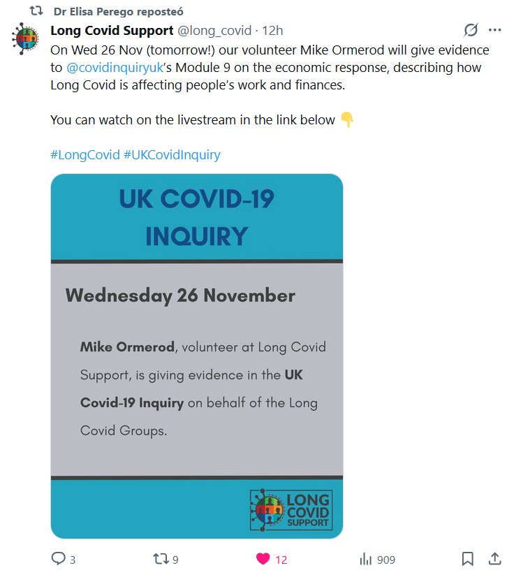 La Dra. Elisa Perego reportó Apoyo para la Covid Persistente @long_covid · El miércoles 26 de noviembre, nuestro voluntario Mike Ormerod participará en el Módulo 9 de @covidinquiryuk sobre la respuesta económica, describiendo cómo la Covid Persistente está afectando el trabajo y las finanzas de las personas. Puedes seguir la transmisión en vivo en el enlace de abajo 👇 #LongCovid #UKCovidInquiry