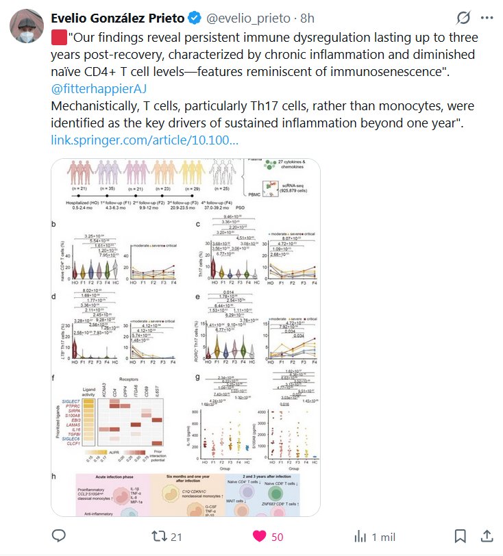 POSTCOVID Dr. Evelio González Prieto @evelio_prieto · 🟥»Nuestros hallazgos revelan una desregulación inmunitaria persistente que dura hasta tres años después de la recuperación, caracterizada por inflamación crónica y una disminución de los niveles de linfocitos T CD4+ vírgenes, características que recuerdan a la inmunosenescencia». @fitterhappierAJ Mecanísticamente, se identificaron los linfocitos T, en particular los linfocitos Th17, en lugar de los monocitos, como los principales impulsores de la inflamación sostenida más allá de un año».