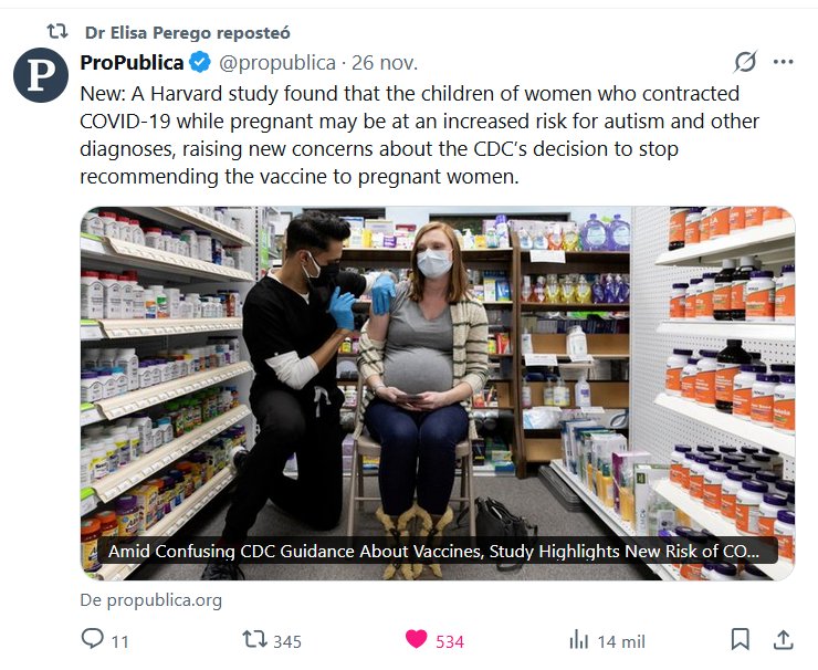 La Dra. Elisa Perego repitió ProPublica @propublica · Noticia: Un estudio de Harvard descubrió que los hijos de mujeres que contrajeron COVID-19 durante el embarazo podrían tener un mayor riesgo de autismo y otros diagnósticos, lo que genera nuevas preocupaciones sobre la decisión de los CDC de dejar de recomendar la vacuna a las mujeres embarazadas.