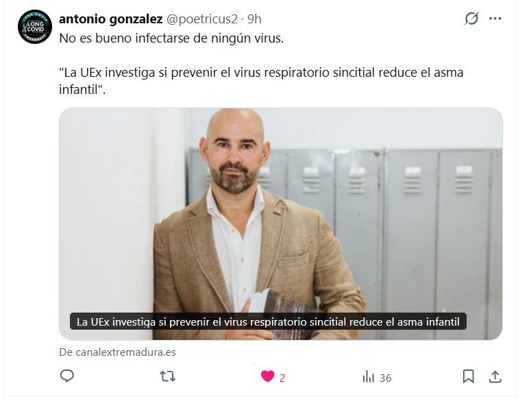 Prof. Antonio González @poetricus2 · No es bueno infectarse de ningún virus. «La UEx investiga si prevenir el virus respiratorio sincitial reduce el asma infantil» Posted on noviembre 27, 2025 por coronado