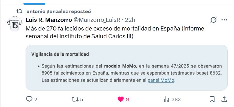 BLACK FRIDAY CON DESCUENTO antonio gonzalez reposteó Luis R. Manzorro @Manzorro_LuisR · 22h Más de 270 fallecidos de exceso de mortalidad en España (informe semanal del Instituto de Salud Carlos III)