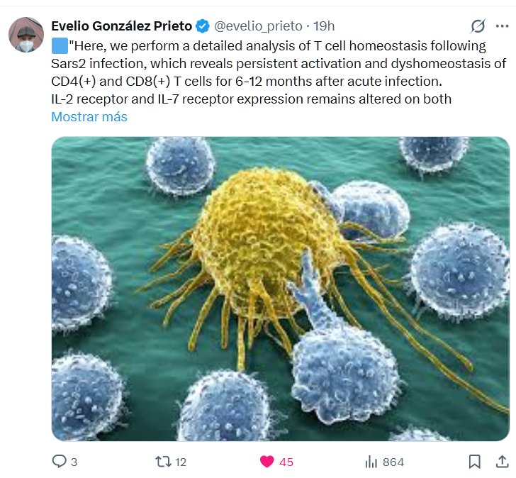 Dr. Evelio González Prieto @evelio_prieto · 🟦»Aquí, realizamos un análisis detallado de la homeostasis de las células T tras la infección por SARS-CoV-2, que revela una activación persistente y dishomeostasis de las células T CD4(+) y CD8(+) durante 6-12 meses tras la infección aguda.