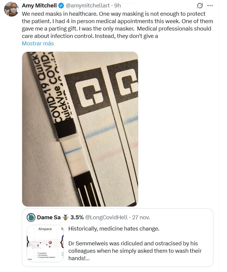 TESTIMONIOS Amy Mitchell @amymitchellart · Necesitamos mascarillas en la atención médica. En cierto sentido, usar mascarilla no es suficiente para proteger al paciente. Tuve cuatro citas médicas presenciales esta semana. En una de ellas me dieron un regalo de despedida. Yo era la única que usaba mascarilla. Los profesionales médicos deberían preocuparse por el control de infecciones. En cambio, les da igual. ¡Estoy harta del COVID! Esta es la infección confirmada número 9.