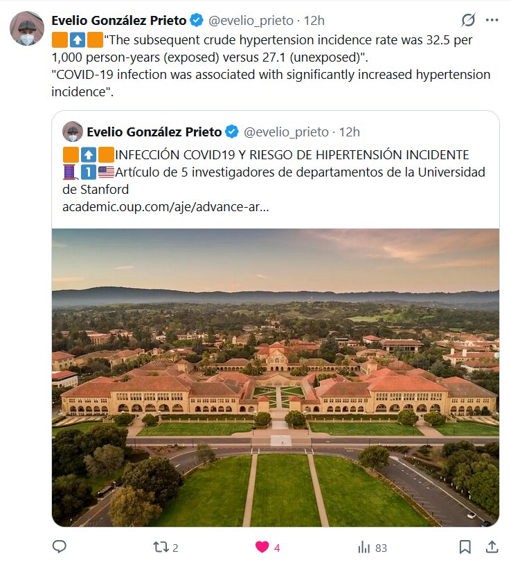 Dr. Evelio González Prieto @evelio_prieto · 🟧⬆️🟧 «La tasa bruta de incidencia de hipertensión subsiguiente fue de 32,5 por 1000 personas-año (expuestas) frente a 27,1 (no expuestas)». «La infección por COVID-19 se asoció con un aumento significativo de la incidencia de hipertensión».