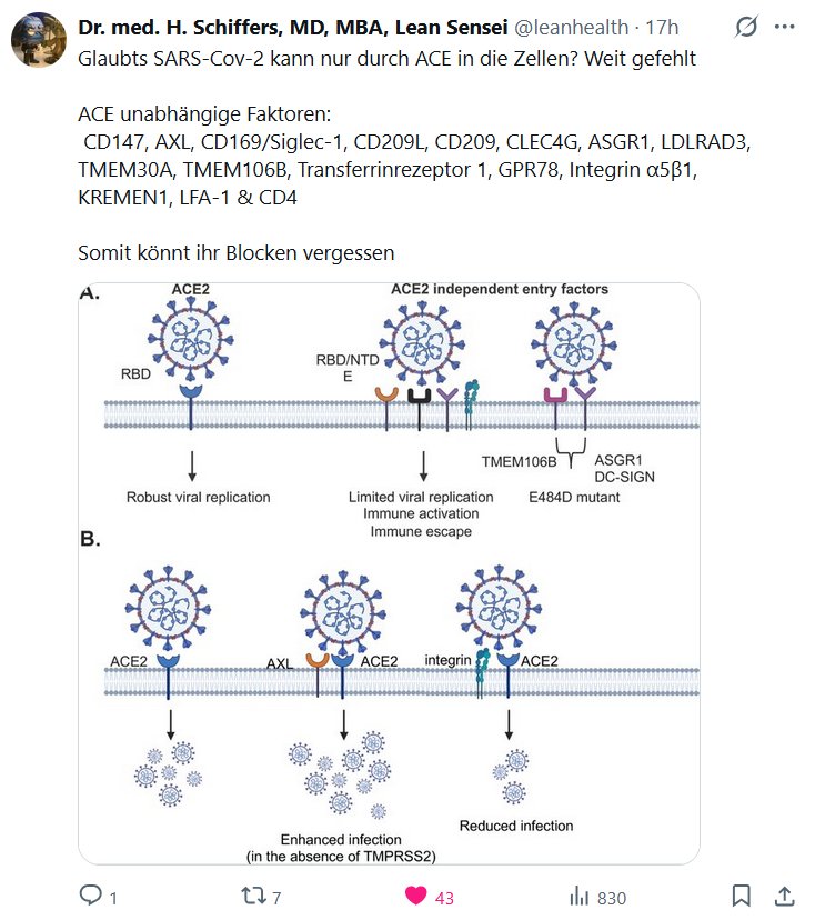 EN ALEMÁN Dr. med. H. Schiffers, MD, MBA, Lean Sensei @leanhealth · ¿Creéis que el SARS-Cov-2 solo puede entrar en las células a través del ACE? Nada más lejos de la realidad. Factores independientes del ACE: CD147, AXL, CD169/Siglec-1, CD209L, CD209, CLEC4G, ASGR1, LDLRAD3, TMEM30A, TMEM106B, receptor de transferrina 1, GPR78, integrina α5β1, KREMEN1, LFA-1 y CD4. Por lo tanto, podéis olvidaros de los bloqueos. Traducción realizada con la versión gratuita del traductor DeepL.com
