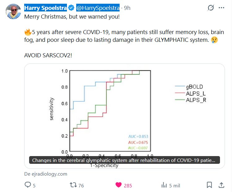 Harry Spoelstra @HarrySpoelstra ¡Feliz Navidad, pero te lo advertimos! 🔥Cinco años después de un caso grave de COVID-19, muchos pacientes aún sufren pérdida de memoria, confusión mental y falta de sueño debido al daño permanente en su sistema linfático. 😢 ¡EVITAR EL SARS-CoV-2!