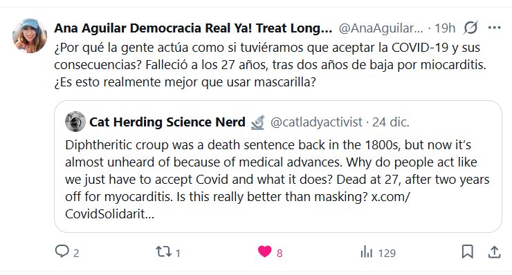 SIGO ESCUCHANDO VOCES (QUE SON GRITOS) Ana Aguilar Democracia Real Ya! Treat Long Covid! @AnaAguilarPAC · 19h ¿Por qué la gente actúa como si tuviéramos que aceptar la COVID-19 y sus consecuencias? Falleció a los 27 años, tras dos años de baja por miocarditis. ¿Es esto realmente mejor que usar mascarilla?