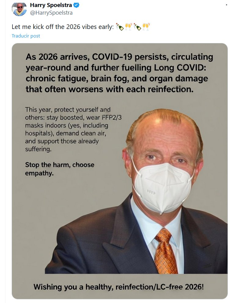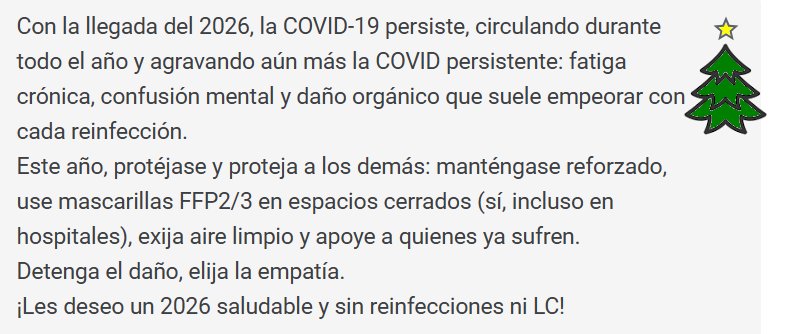 Con la llegada del 2026, la COVID-19 persiste, circulando durante todo el año y agravando aún más la COVID persistente: fatiga crónica, confusión mental y daño orgánico que suele empeorar con cada reinfección. Este año, protéjase y proteja a los demás: manténgase reforzado, use mascarillas FFP2/3 en espacios cerrados (sí, incluso en hospitales), exija aire limpio y apoye a quienes ya sufren. Detenga el daño, elija la empatía. ¡Les deseo un 2026 saludable y sin reinfecciones ni LC!
