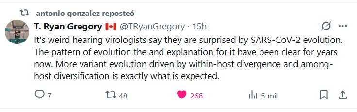 T. Ryan Gregory 🇨🇦 @TRyanGregory · Es extraño oír a los virólogos decir que están sorprendidos por la evolución del SARS-CoV-2. El patrón de evolución y su explicación son claros desde hace años. Una mayor evolución de variantes impulsada por la divergencia dentro del huésped y la diversificación entre huéspedes es exactamente lo que se espera.