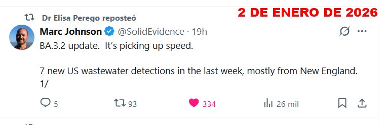 «FIN DE PANDEMIA» 2026 La Dra. Elisa Perego reportó a Marc Johnson @SolidEvidence · Actualización de BA.3.2. [VARIANTE DE SARS-COV-2 QUE PRODUCE COVID-19] Está ganando impulso. 7 nuevas detecciones de aguas residuales en EE. UU. la semana pasada, principalmente en Nueva Inglaterra.