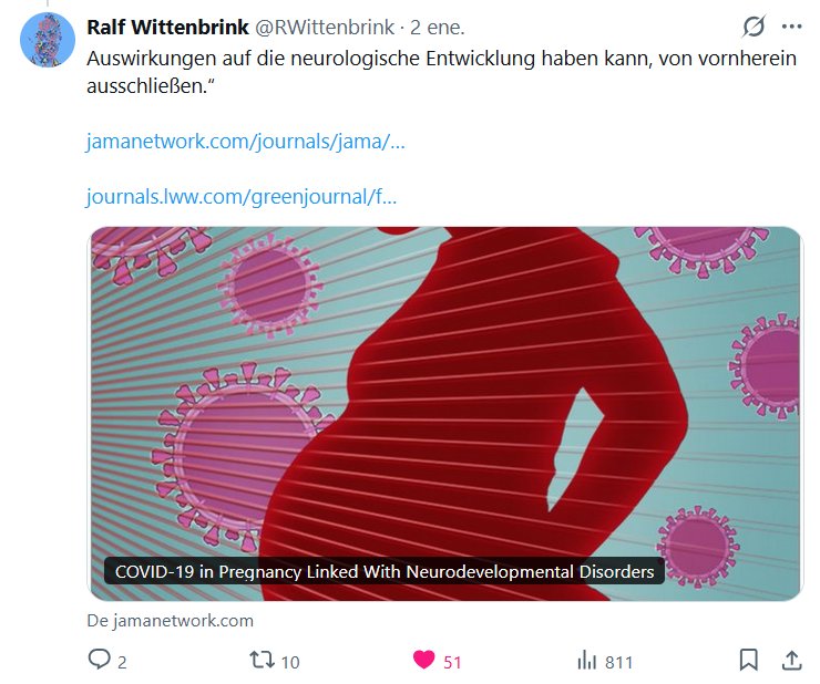 EN ALEMÁN Ralf Wittenbrink @RWittenbrink · 2 de enero de 2026 La infección por COVID-19 durante el embarazo aumenta el riesgo de trastornos del desarrollo neurológico en la primera infancia. «Casi seis años después del inicio de la pandemia de COVID-19, los investigadores siguen descubriendo posibles consecuencias a largo plazo. Los niños que se infectaron durante el embarazo…»