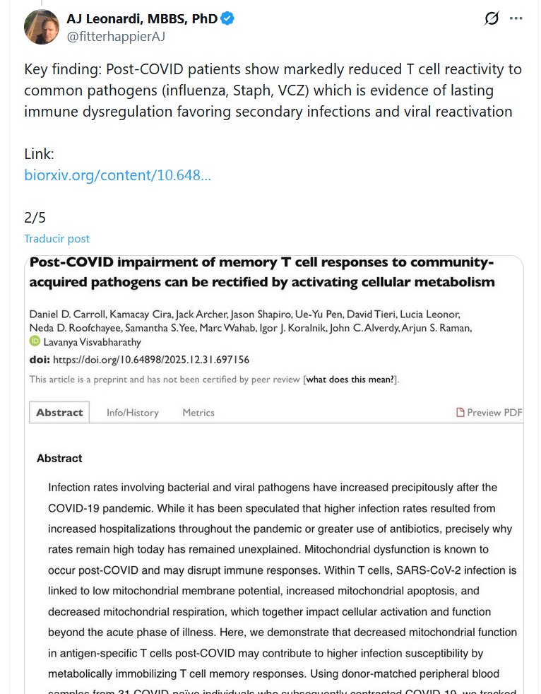 AJ Leonardi, MBBS, PhD @fitterhappierAJ Hallazgo clave: Los pacientes post-COVID muestran una reactividad de células T notablemente reducida a patógenos comunes (gripe, estafilococo, VCZ), lo que evidencia una desregulación inmunitaria persistente que favorece las infecciones secundarias y la reactivación viral.