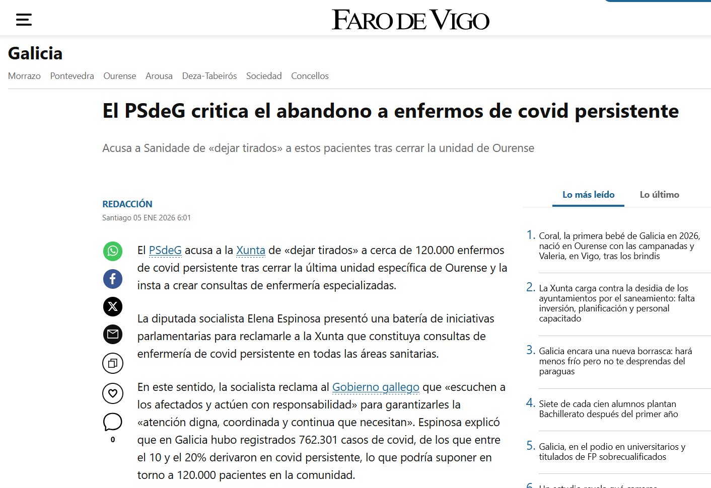 NO ERA LEVE El PSdeG critica el abandono a enfermos de covid persistente El PSdeG acusa a la Xunta de «dejar tirados» a cerca de 120.000 enfermos de covid persistente tras cerrar la última unidad específica de Ourense