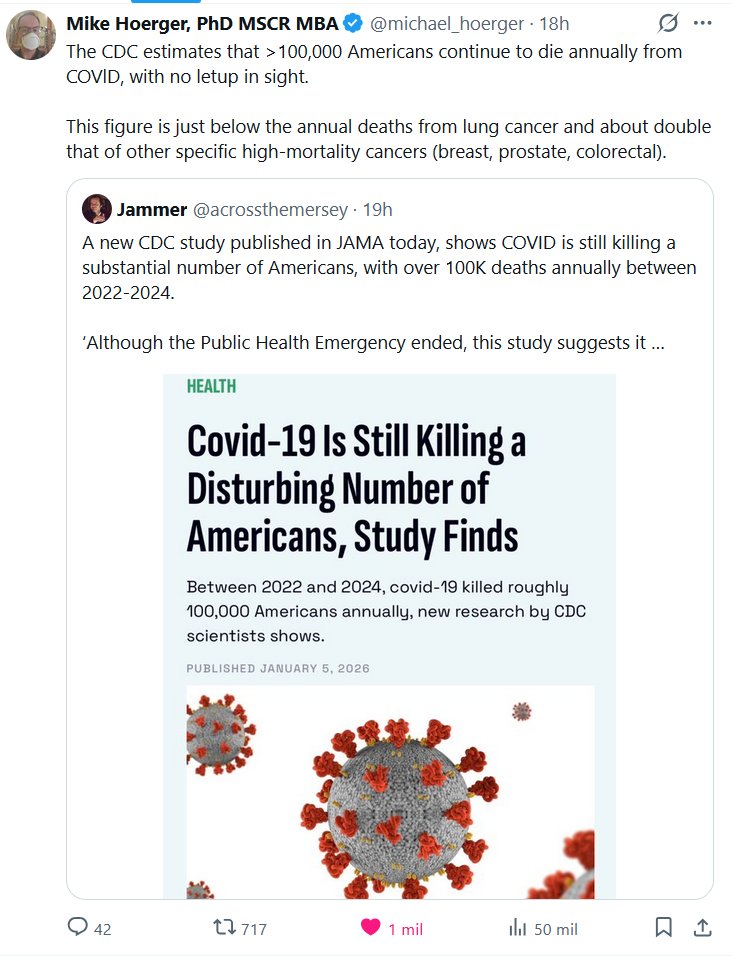 Mike Hoerger, PhD MSCR MBA @michael_hoerger · Los CDC estiman que más de 100,000 estadounidenses siguen muriendo anualmente por COVID-19, sin que se vislumbre una disminución. Esta cifra es ligeramente inferior a las muertes anuales por cáncer de pulmón y aproximadamente el doble de la de otros cánceres específicos de alta mortalidad (mama, próstata, colorrectal)