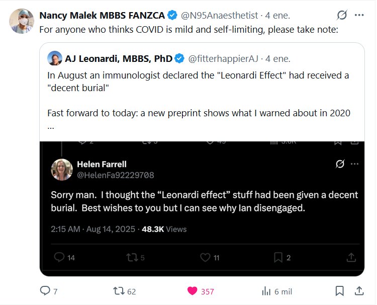 Nancy Malek, MBBS, FANZCA @N95Anaesthetist · Para quienes piensen que la COVID-19 es leve y autolimitada, por favor, tomen nota: Cita a AJ Leonardi, MBBS, PhD @fitterhappierAJ · En agosto, un inmunólogo declaró que el «Efecto Leonardi» había recibido un «sepelio digno». Un avance rápido hasta hoy: una nueva preimpresión muestra lo que advertí en 2020.