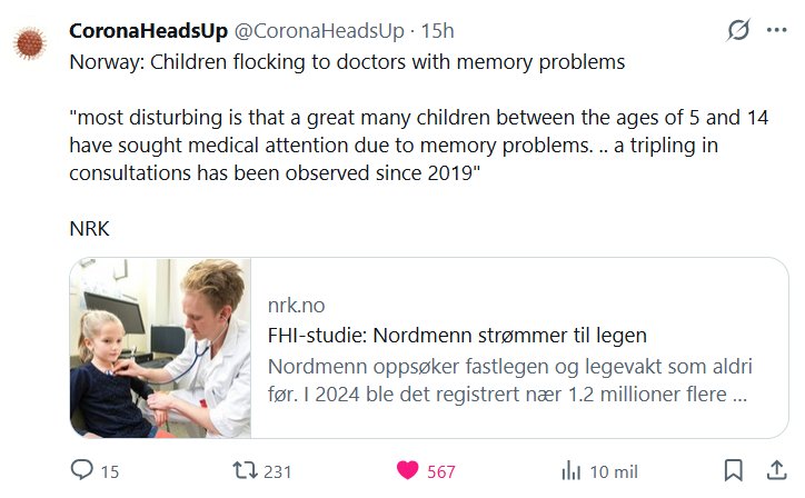 POSTCOVID CoronaHeadsUp @CoronaHeadsUp · Noruega: Niños acuden masivamente al médico por problemas de memoria «Lo más preocupante es que un gran número de niños de entre 5 y 14 años han buscado atención médica debido a problemas de memoria… Se ha observado que las consultas se han triplicado desde 2019»