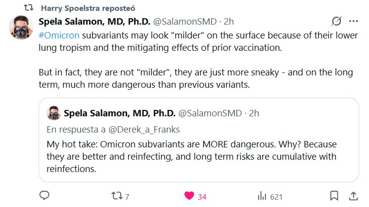 Mi opinión: Las subvariantes Ómicron son MÁS peligrosas. ¿Por qué? Porque son mejores y reinfectan, y los riesgos a largo plazo se acumulan con las reinfecciones.