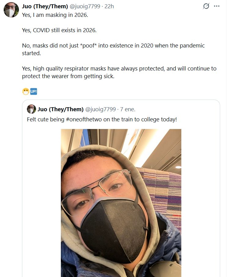 JUO @juoig7799 Sí, usaré mascarilla en 2026. Sí, la COVID-19 sigue existiendo en 2026. No, las mascarillas no aparecieron de repente en 2020, cuando comenzó la pandemia. Sí, las mascarillas respiratorias de alta calidad siempre han protegido y seguirán protegiendo a quien las usa de enfermarse.