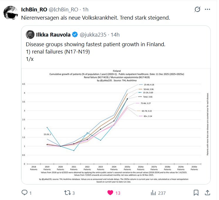 NODIGAMOSCOVID Y POSTCOVID HACEN ESTRAGOS (EN ALEMÁN) SE ACUMULAN LOS PACIENTES IchBin_RO @IchBin_RO · La insuficiencia renal es una nueva enfermedad generalizada. La tendencia está aumentando drásticamente.