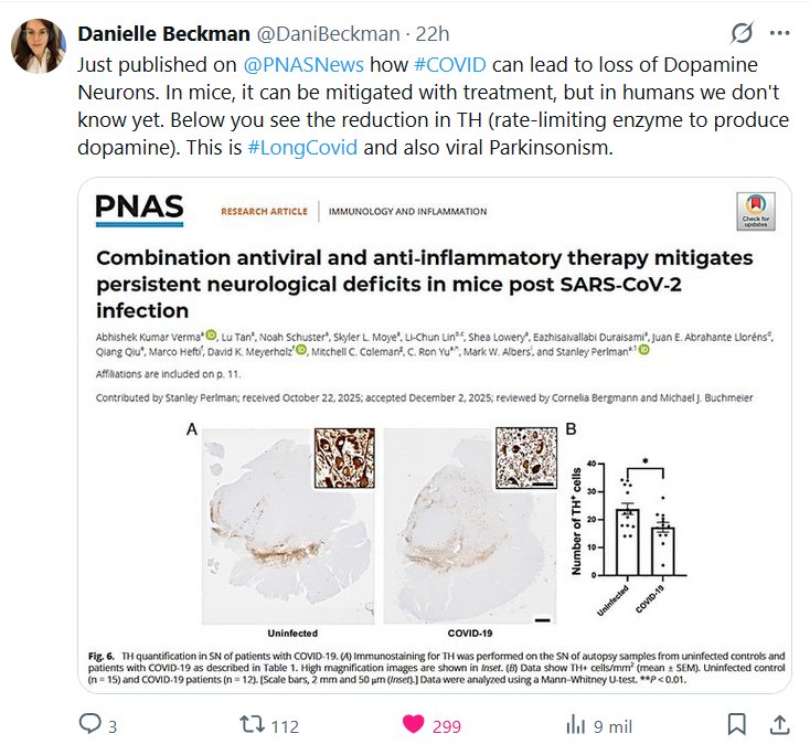 Danielle Beckman @DaniBeckman · Recién publicado en @PNASNews cómo la #COVID puede provocar la pérdida de neuronas dopaminérgicas. En ratones, se puede mitigar con tratamiento, pero en humanos aún no lo sabemos. A continuación se observa la reducción de la TH (enzima limitante de la velocidad de producción de dopamina). Esto se debe a la #CovidProlongada y también al parkinsonismo viral.