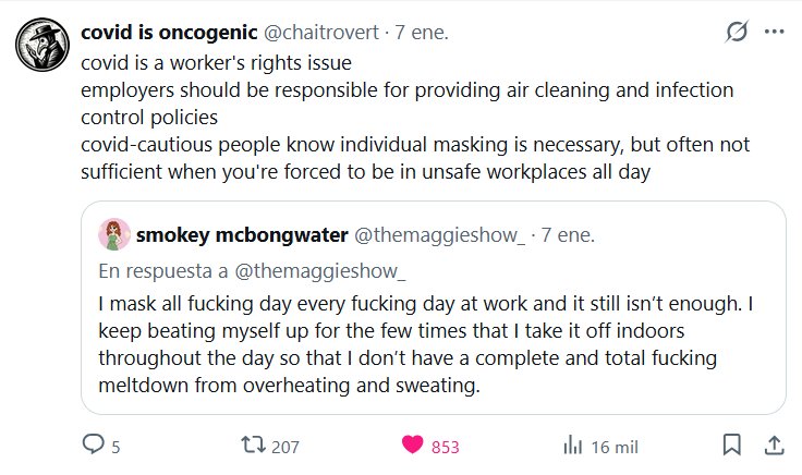 Las personas precavidas con el COVID saben que el uso individual de mascarillas es necesario, pero a menudo no es suficiente cuando te ves obligado a estar en lugares de trabajo inseguros todo el día Cita smokey mcbongwater @themaggieshow_ · En respuesta a @themaggieshow_ Llevo mascarilla todo el día, todos los días, en el trabajo, y aun así no es suficiente. Me sigo castigando por las pocas veces que me la quito en interiores para no tener un colapso total por el calor y el sudor.