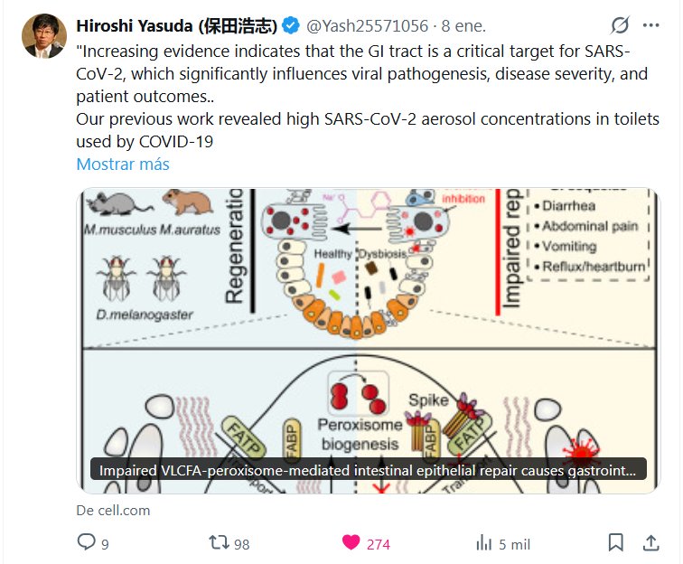 Hiroshi Yasuda (保田浩志) @Yash25571056 · «Cada vez hay más evidencia que indica que el tracto gastrointestinal es un objetivo crítico para el SARS-CoV-2, lo que influye significativamente en la patogénesis viral, la gravedad de la enfermedad y la evolución del paciente. Nuestro trabajo previo reveló altas concentraciones de aerosoles de SARS-CoV-2 en los baños utilizados por personas con COVID-19.
