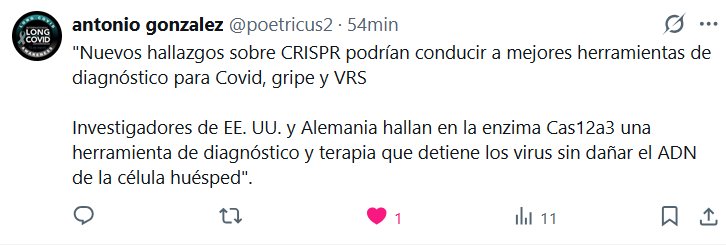 Prof. Antonio González @poetricus2 · «Nuevos hallazgos sobre CRISPR podrían conducir a mejores herramientas de diagnóstico para Covid, gripe y VRS Investigadores de EE. UU. y Alemania hallan en la enzima Cas12a3 una herramienta de diagnóstico y terapia que detiene los virus sin dañar el ADN de la célula huésped».