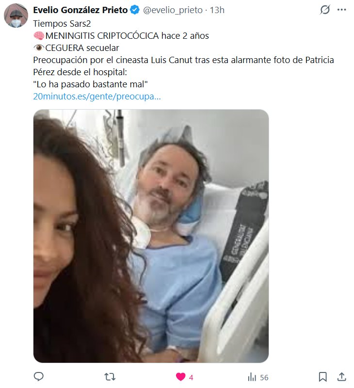 DR. Evelio González Prieto @evelio_prieto · Tiempos Sars2 🧠MENINGITIS CRIPTOCÓCICA hace 2 años 👁️CEGUERA secuelar Preocupación por el cineasta Luis Canut tras esta alarmante foto de Patricia Pérez desde el hospital: «Lo ha pasado bastante mal»