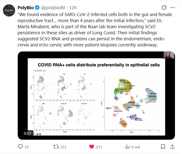 PolyBio @polybioRF · “Encontramos evidencia de células infectadas por SARS-CoV-2 tanto en el intestino como en el tracto reproductivo femenino… más de 4 años después de la infección inicial”, afirmó la Dra. Marta Mirabent, quien forma parte del equipo del laboratorio de Roan que investiga la persistencia del SCV2 en estos sitios como factor desencadenante de la Covid persistente…