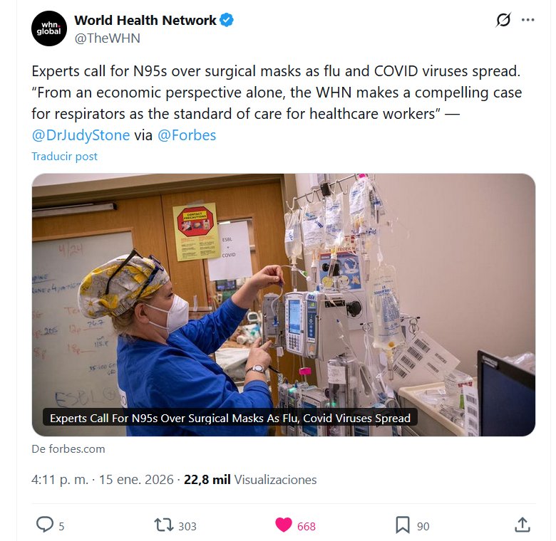 Red Mundial de la Salud @TheWHN Expertos recomiendan el uso de mascarillas N95 en lugar de mascarillas quirúrgicas ante la propagación de la gripe y la COVID-19. “Solo desde una perspectiva económica (?), la WHN defiende con convicción el uso de respiradores como estándar de atención para el personal sanitario”. — @DrJudyStone vía @Forbes