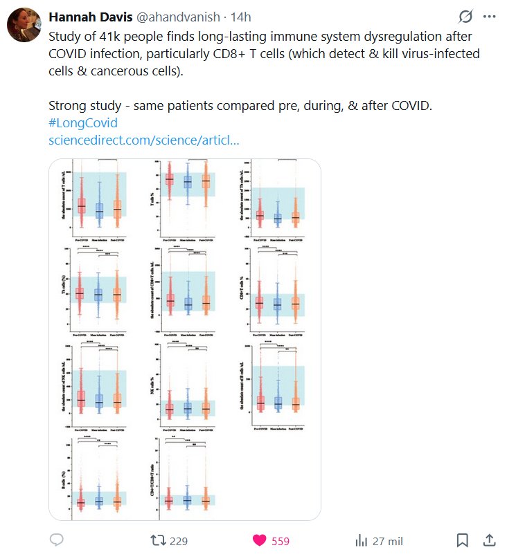 Hannah Davis @ahandvanish · Un estudio de 41.000 personas revela una desregulación prolongada del sistema inmunitario tras la infección por COVID-19, en particular de las células T CD8+ (que detectan y eliminan las células infectadas por el virus y las células cancerosas). Estudio sólido: los mismos pacientes se compararon antes, durante y después de la COVID-19.