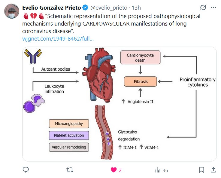 Dr. Evelio González Prieto @evelio_prieto · 🫀💔🫀»Representación esquemática de los mecanismos fisiopatológicos propuestos que subyacen a las manifestaciones cardiovasculares de la enfermedad por coronavirus prolongado».